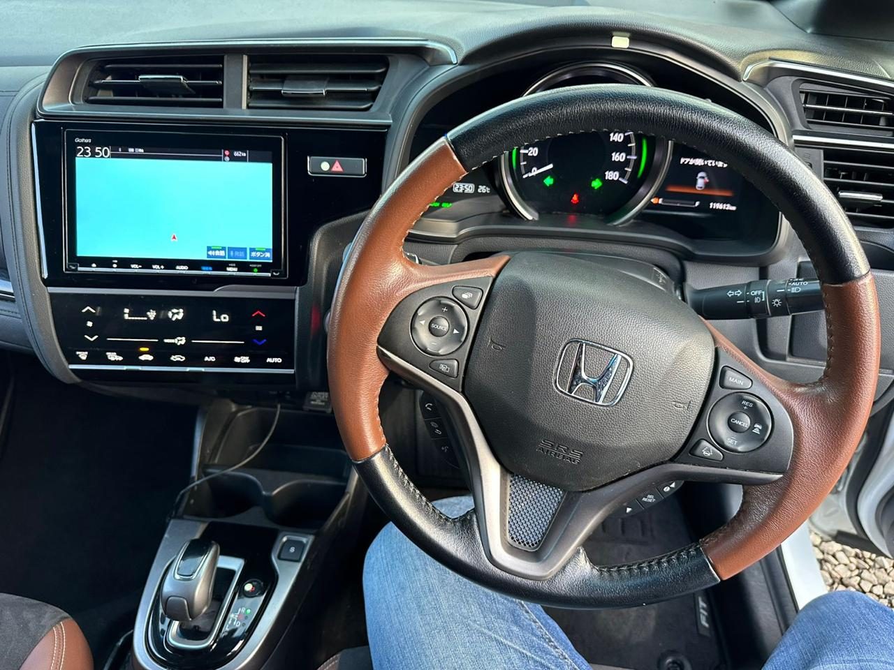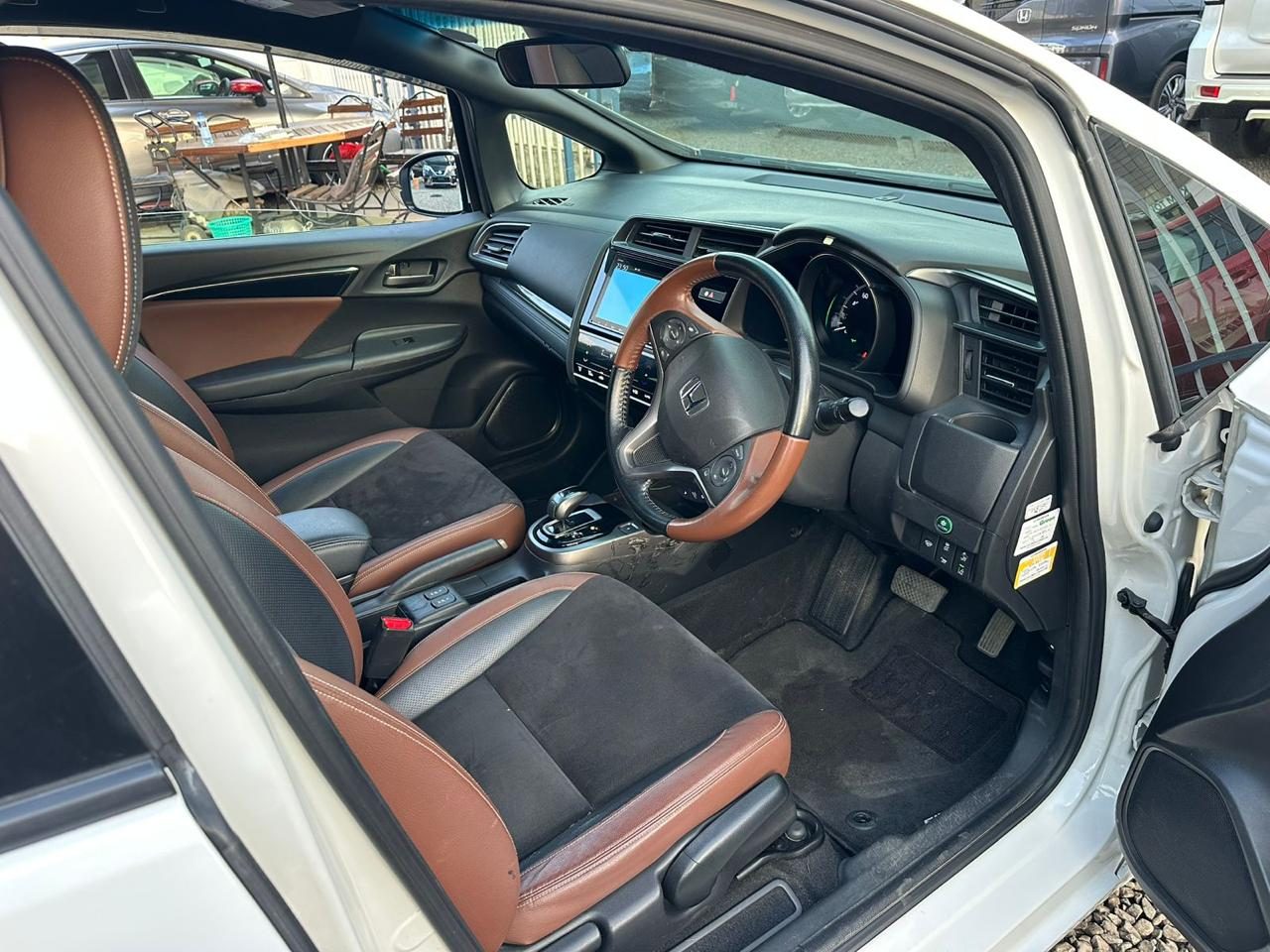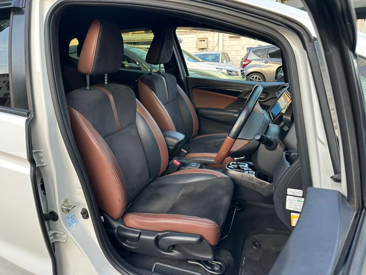 Step inside, and the cabin feels far beyond what its size suggests. It welcomes you with a beautifully balanced two-tone finish of dark grey and brown, giving the interior a warm yet contemporary atmosphere. The design feels intentional—everything positioned with the driver in mind, from the sculpted dashboard to the refined steering wheel trimmed in matching tones. The seats are not just well-contoured but come with a heated function that makes cool mornings far more inviting. Soft-touch surfaces, intelligent storage spaces, and wide visibility enhance the sense of openness, making the Fit’s interior feel airy and sophisticated.