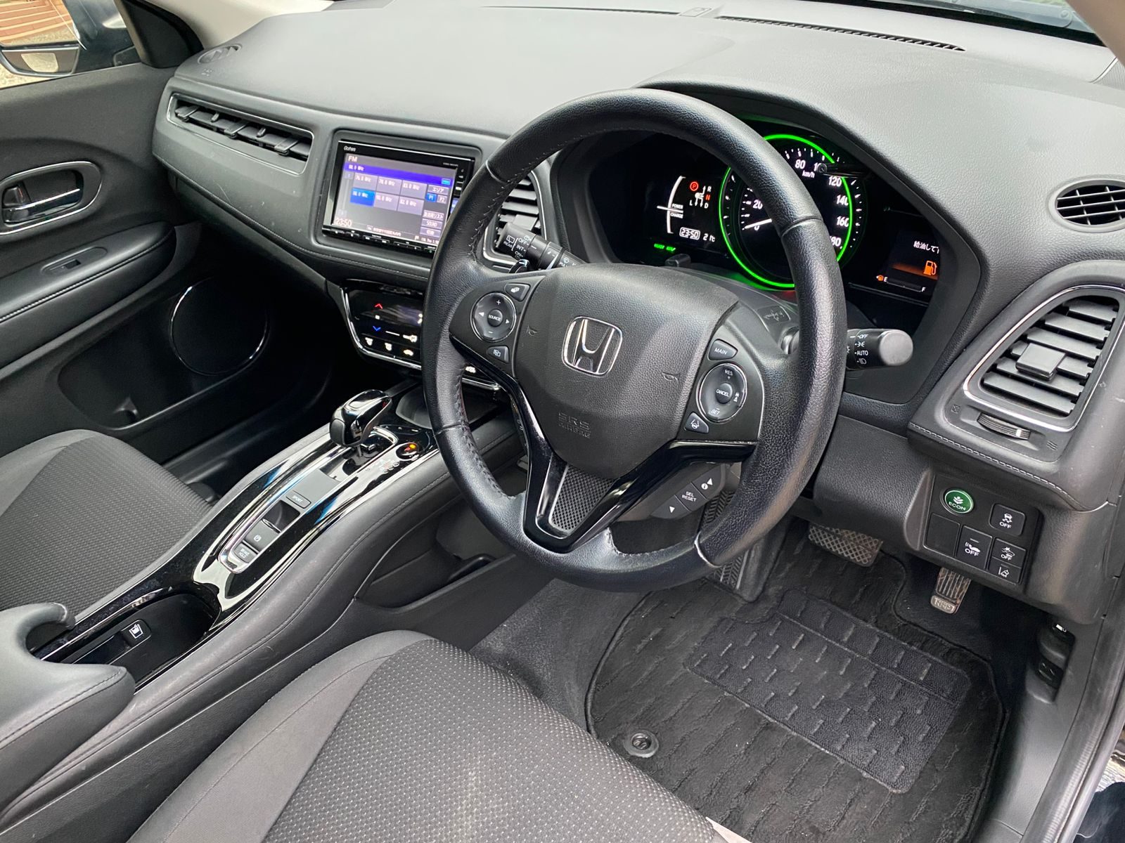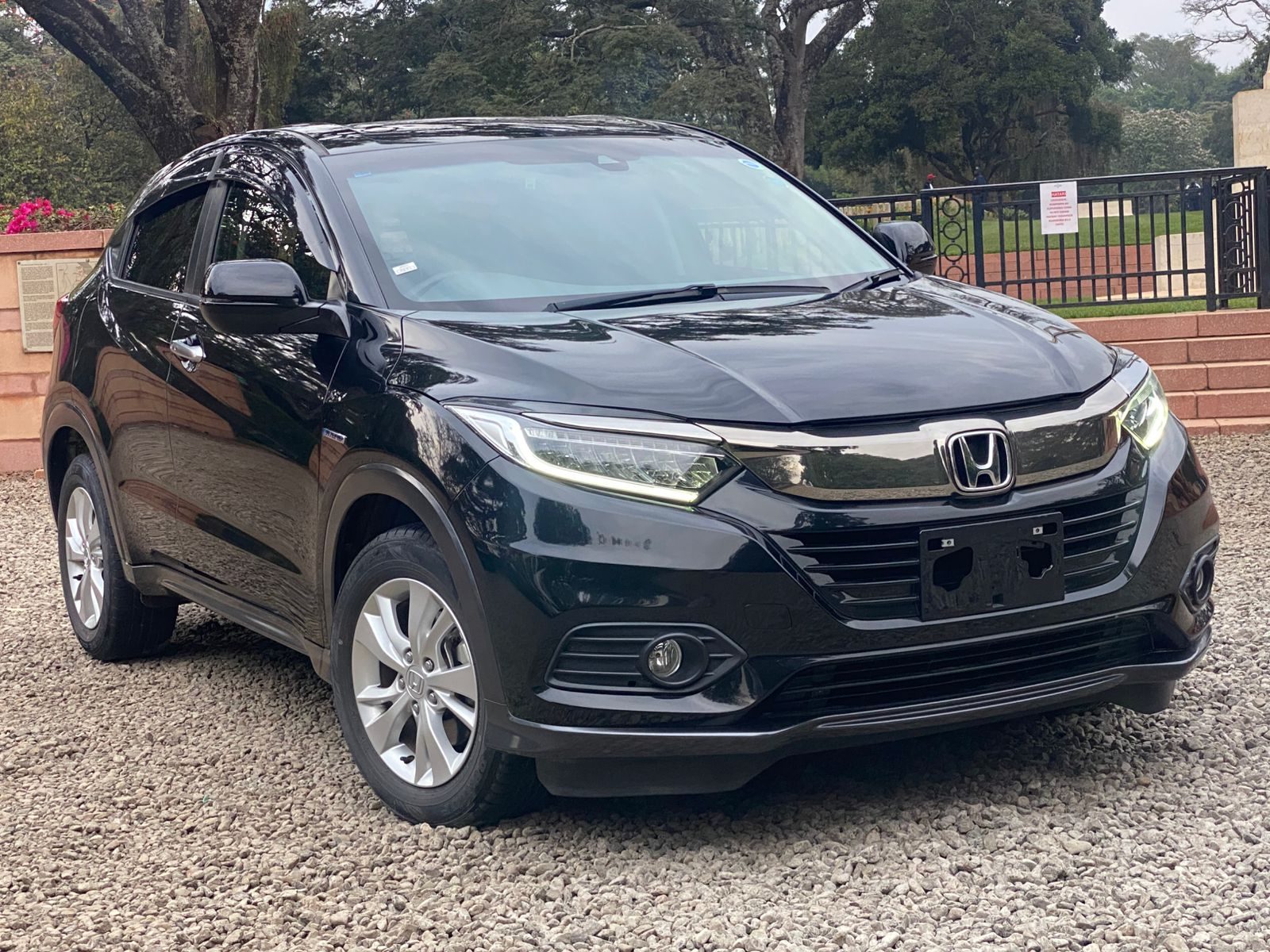 The 2018 Honda Vezel Hybrid in metallic black is a crossover that blends sleek sophistication with modern efficiency, standing out with subtle yet striking details. The deep metallic black finish gives it a polished, premium presence, while the bronze Honda logo and accent strip add a distinctive touch that sets it apart from the ordinary, hinting at both style and individuality. Its coupe-inspired silhouette, sharp character lines, and elevated stance bring a sporty energy to its design, making it as eye-catching in the city as it is capable on open roads.