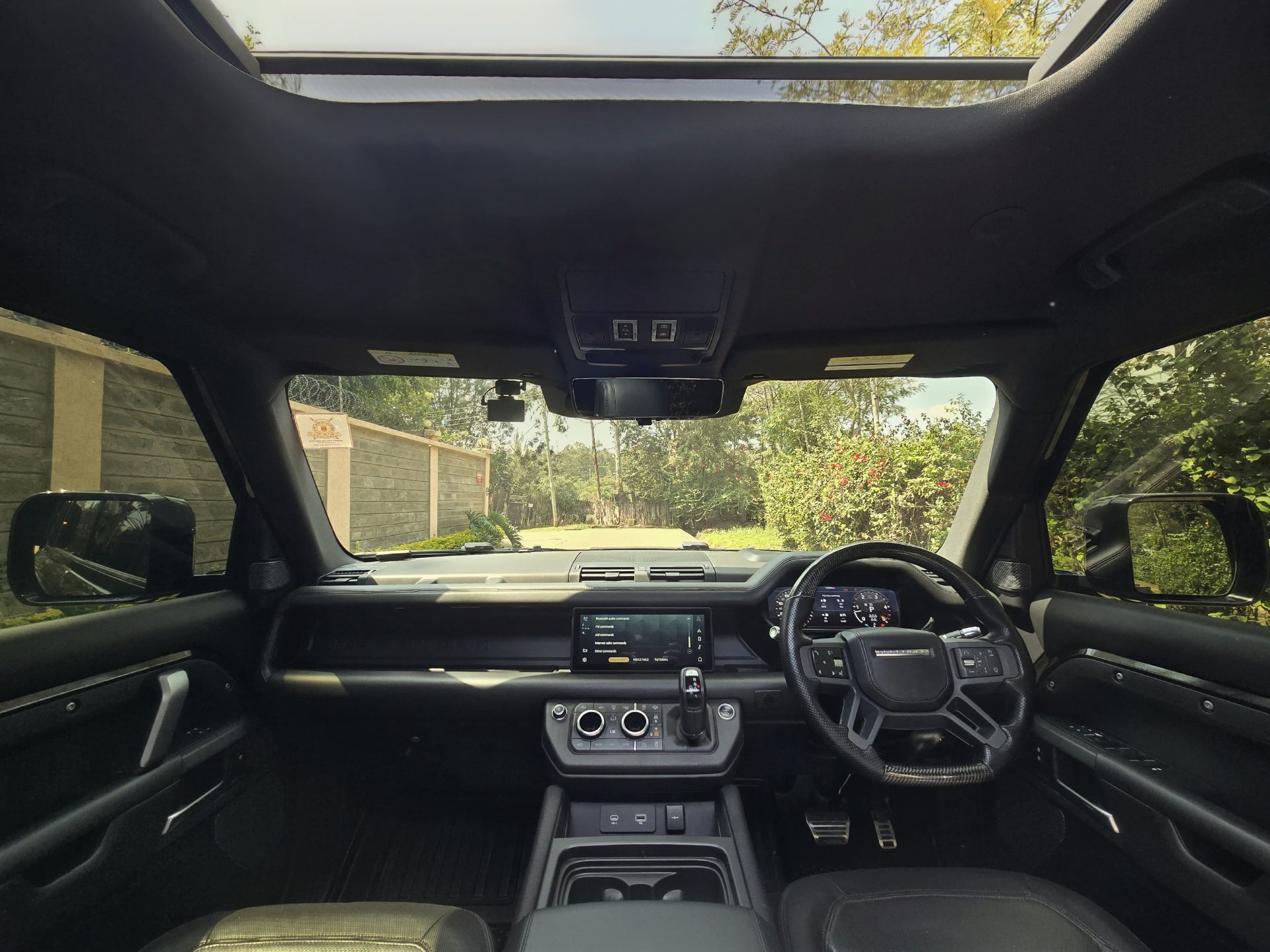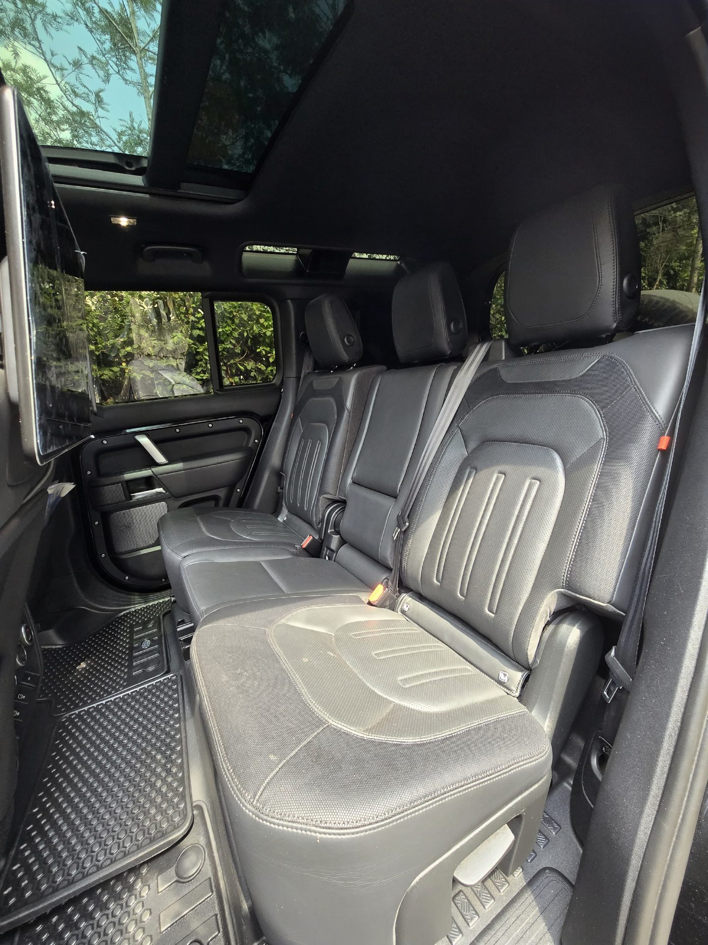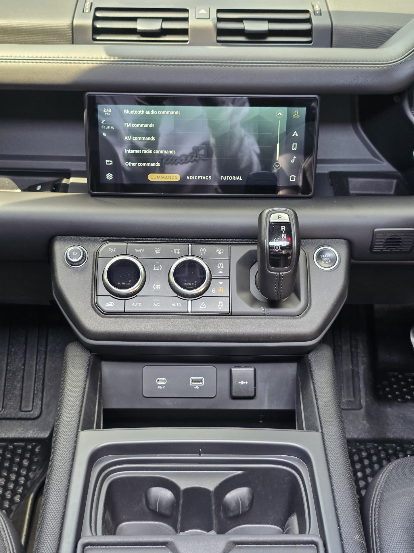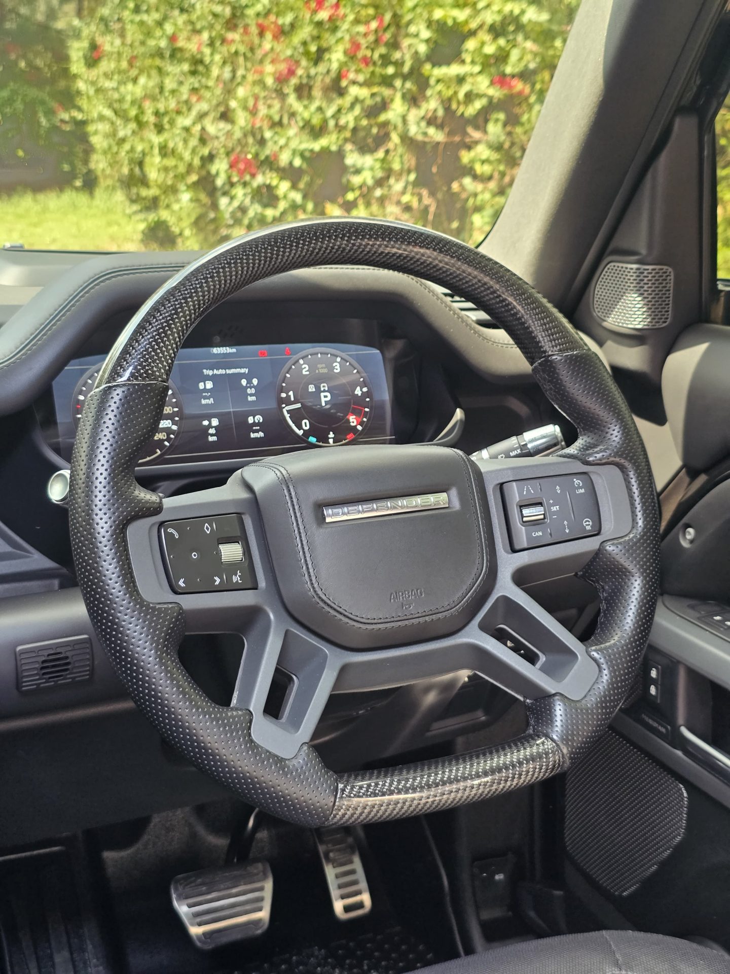 - Finished in Santorini Black, this 2022 Defender 110 P400 X-Dynamic carries serious road presence. It’s bold, upright, and instantly recognizable—modern but still true to the Defender DNA. The blacked-out detailing on the X-Dynamic package gives it that aggressive, premium edge that stands out whether it’s parked or in motion.