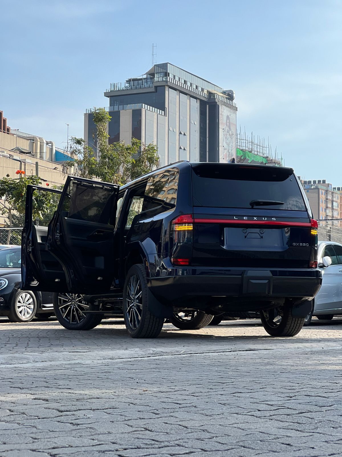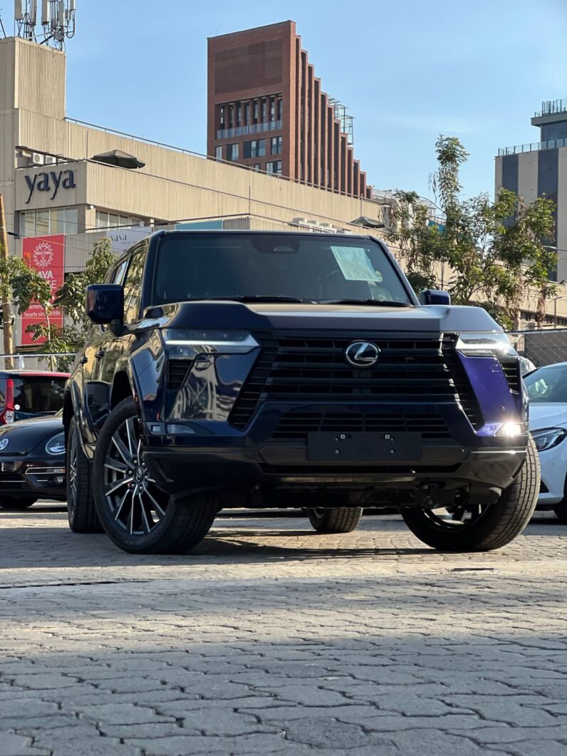 he 2024 Lexus GX 550 in navy blue is a commanding, luxury off-roader that blends rugged performance with upscale sophistication. Sitting on a GA-F platform, it boasts a boxier, more aggressive stance than its predecessors, enhanced by the deep navy hue that gives it a stealthy but elegant edge. Under the hood lies a twin-turbocharged 3.4L V6 pushing out 349 horsepower and 479 Nm of torque, paired to a smooth 10-speed automatic transmission and full-time 4WD. Whether you're cruising the highway or crawling through rough terrain, the GX delivers, especially in Overtrail trims equipped with locking diffs and 33-inch all-terrain tires. Inside, it offers a plush cabin with a massive 14-inch infotainment screen, tri-zone climate control, ventilated leather seats, and optional Mark Levinson audio for audiophiles. Fuel economy averages around 6.4 km/l city and 8.9 km/l highway, making it more of a brute than a fuel-sipper. Despite its premium feel, some corners in interior refinement are noticeable, but if presence, power, and exclusivity are your priorities—especially in this rare navy finish—the GX 550 makes a bold, unapologetic statement.