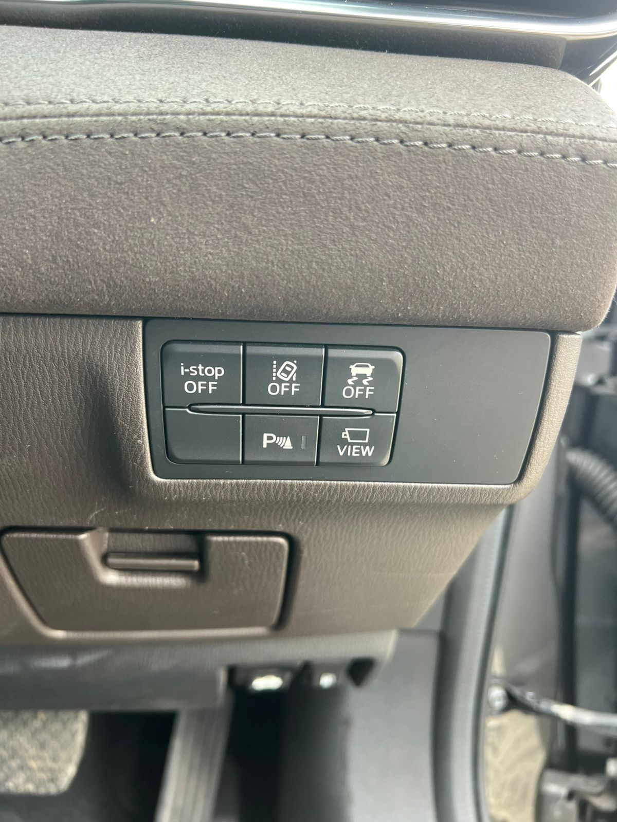The driver’s environment is clean and focused. The dashboard flows smoothly, with leather-wrapped surfaces and carefully placed controls that fall easily to hand. Mazda’s attention to detail shows in the stitching, the texture of the materials, and the way each panel meets the next. The brown leather theme continues across the doors and center console, tying the space together and creating a cohesive, upscale atmosphere.
