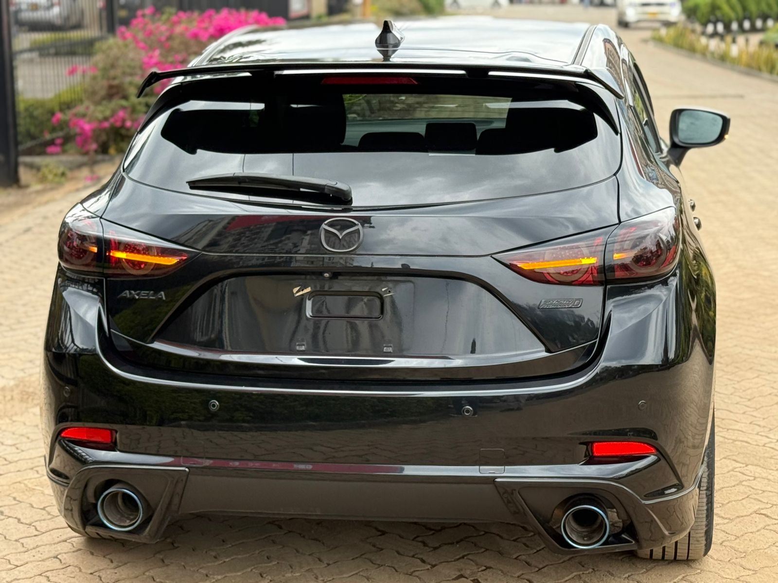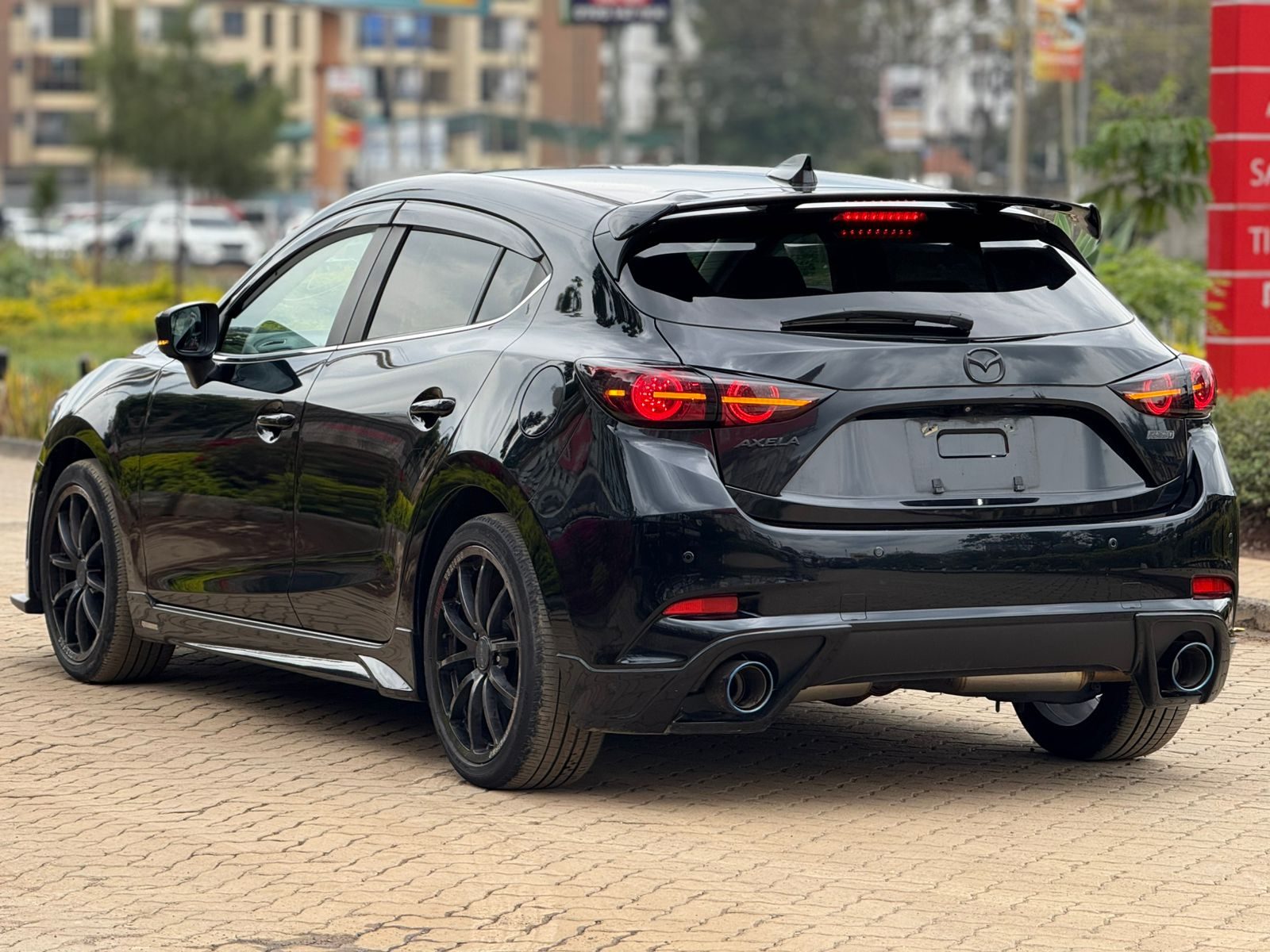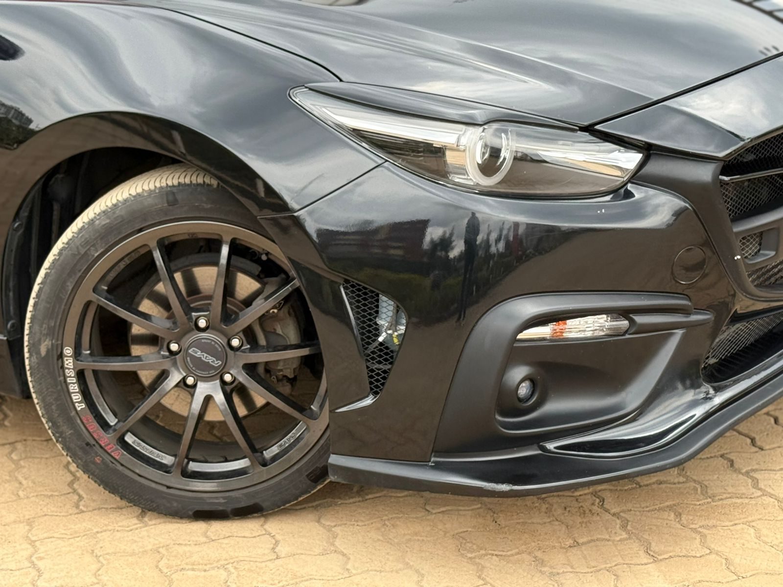 his isn’t just another black hatchback—it’s a machine with attitude. The 2018 Mazda Axela, dressed in midnight black with a sharp body kit, sits low and wide like it was carved for motion. The 18-inch alloys aren’t there for show; they fill the arches perfectly, giving the car a planted stance. Add the smoked lights and subtle rear spoiler, and suddenly this Axela doesn’t just blend into traffic—it dominates it without a word.