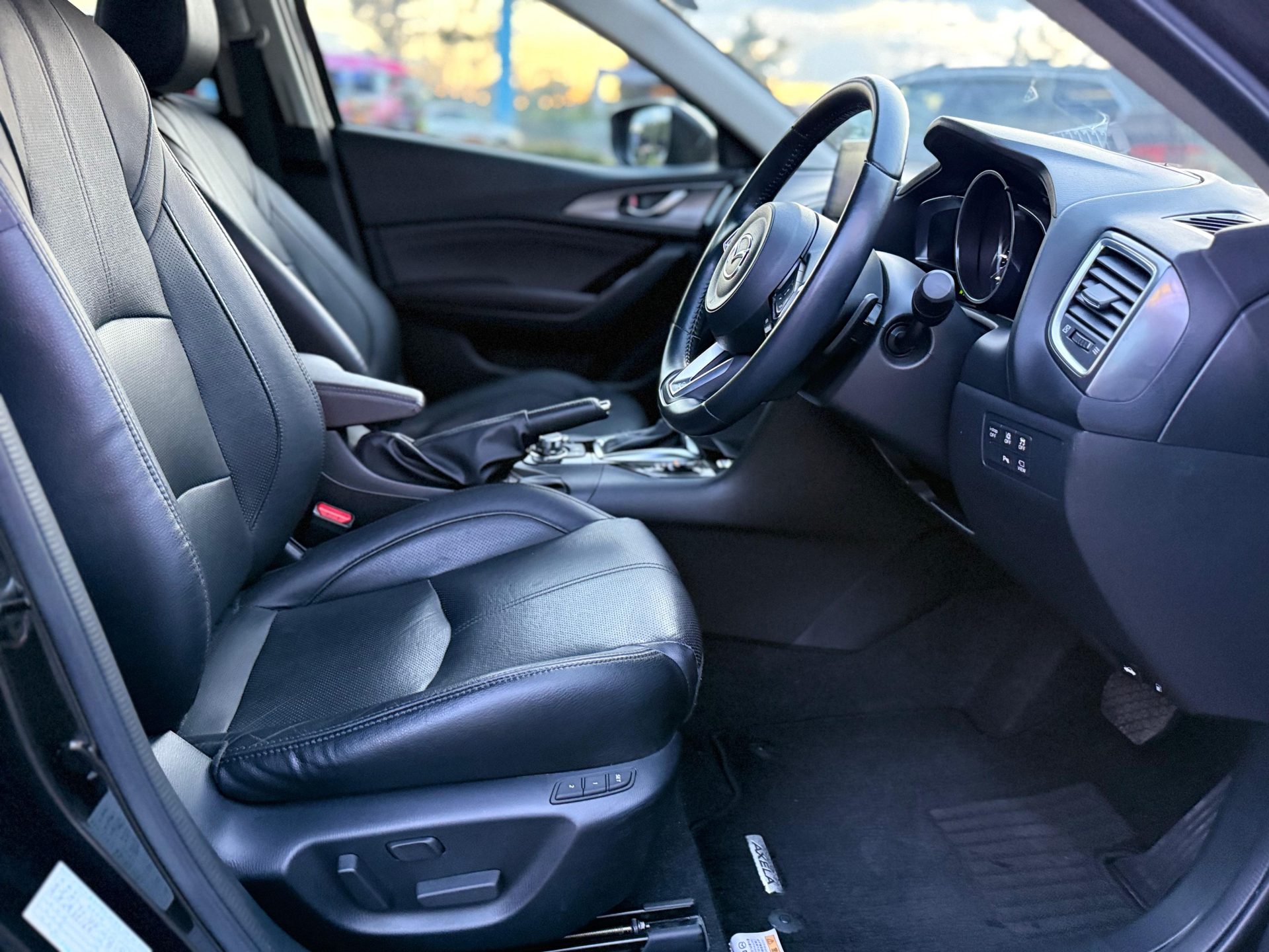Inside, the Axela reveals a fully loaded cabin that leans strongly toward refinement and driver comfort. Leather seats elevate the interior atmosphere, giving it a premium feel uncommon in its class. Memory-equipped front seats ensure the driving position is always tailored and ready, reinforcing the sense that the cabin adapts to the driver rather than the other way around. The layout is clean and intuitive, creating a focused environment that supports long drives and daily use alike.