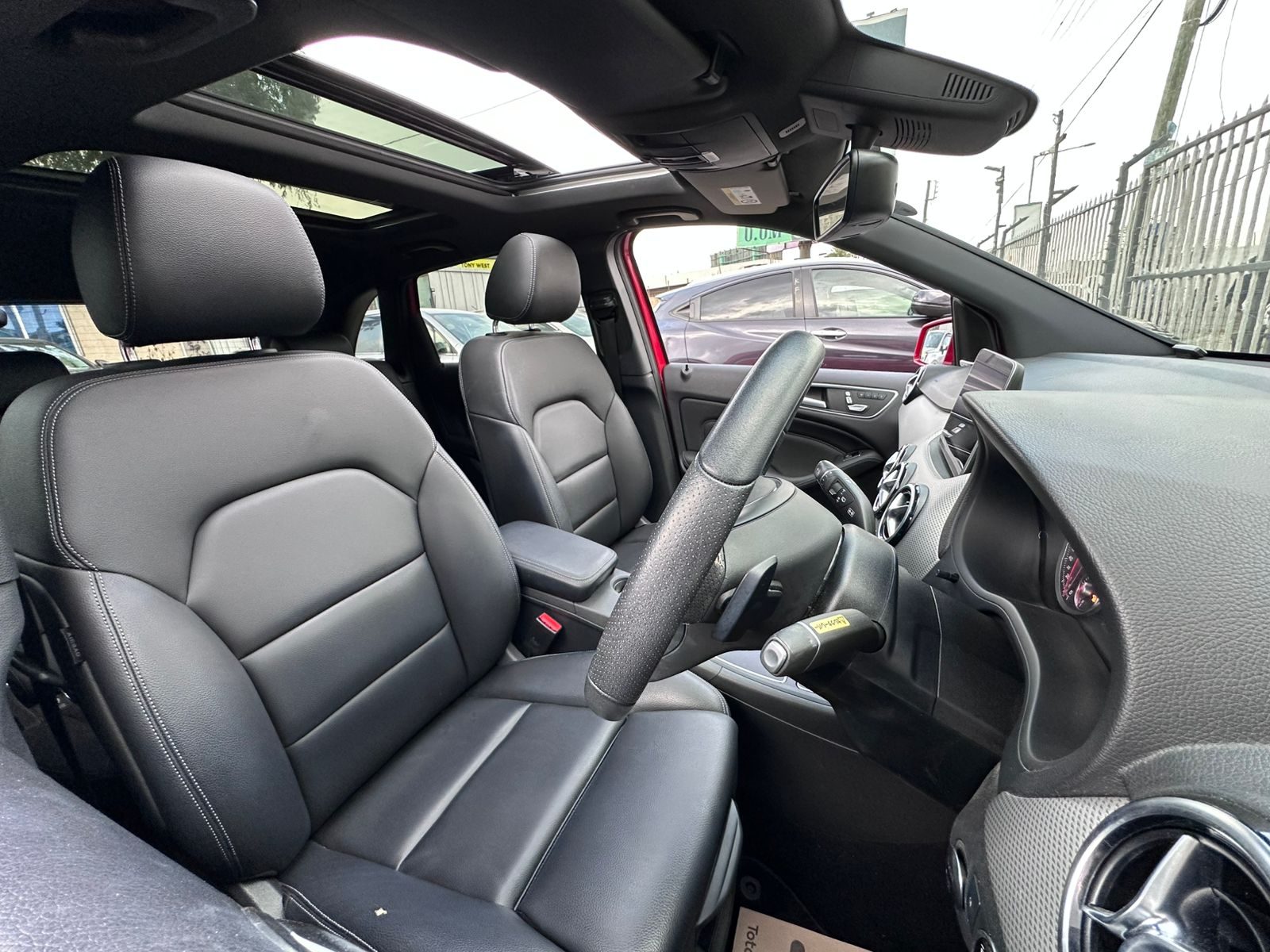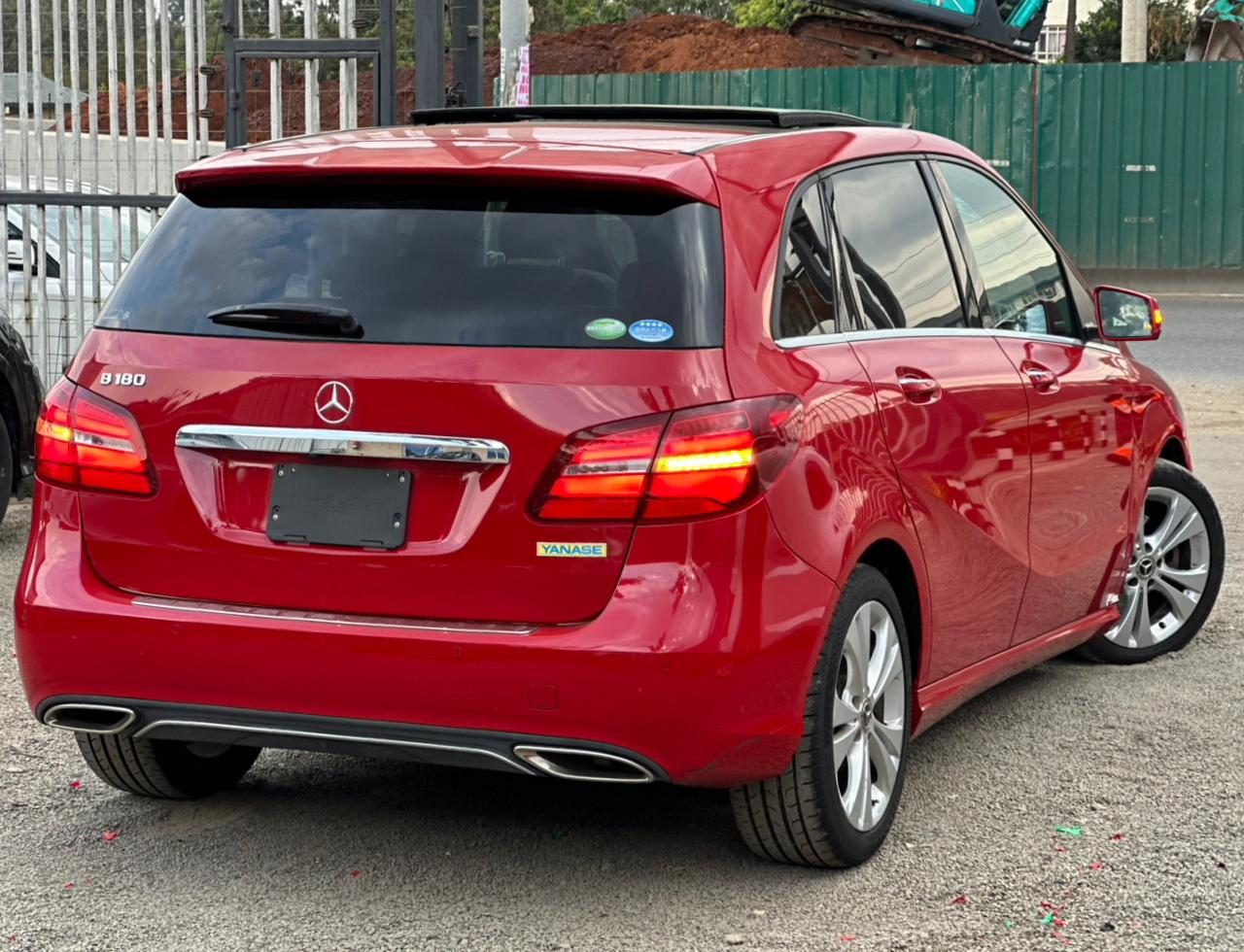 The Mercedes-Benz B180 wears its wine-red exterior like a statement piece rich, deep and effortlessly elegant. The colour highlights the smooth curves and sharp character lines that give this compact MPV a poised, sporty stance. A bold three-pointed star sits proudly at the front grille, flanked by sleek headlamps that lend a confident gaze. Chrome touches around the windows and the subtle rear spoiler add a premium sparkle, while the panoramic sunroof stretches across the roofline, creating a light, airy impression even from the outside. Alloy wheels complete the picture, giving the car a well-balanced look that blends praticality with the signature presence of Mercedes design.