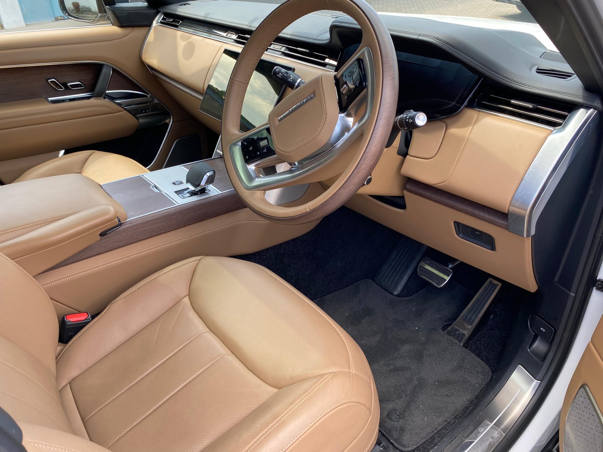 The new-generation Range Rover doesn’t just stand tall; it redefines modern luxury SUVs. Finished in a glossy white exterior, contrasted by 22-inch multi-spoke alloys and a blacked-out roofline detail, this Autobiography makes a bold yet sophisticated statement. From the flush-fitting door handles to the futuristic LED lighting and the sleek rear tailgate design, every angle whispers authority with elegance.