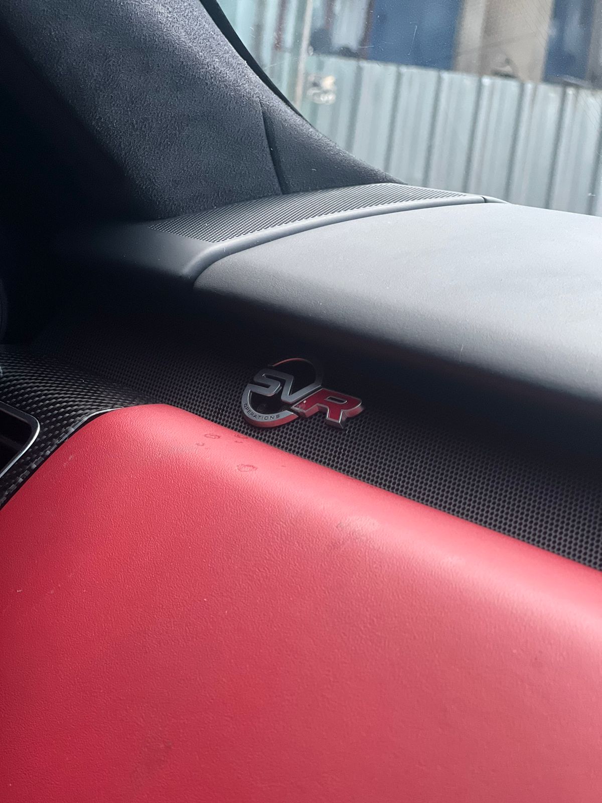 Inside, the cabin is a statement of deliberate luxury and performance focus. All seats—from the driver to rear passengers—feature heated and cooled functionality, ensuring comfort in every climate. Deeply bolstered SVR sport seats, finished in dual-tone leather, hold occupants securely while conveying motorsport flair. The panoramic sunroof floods the cabin with light, balancing the dark, performance-driven interior theme.