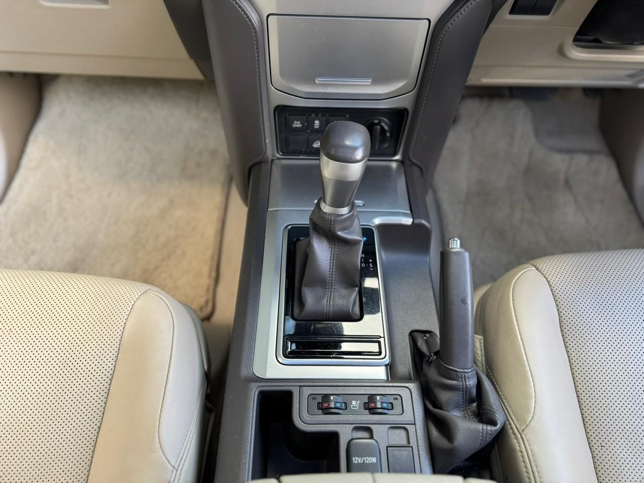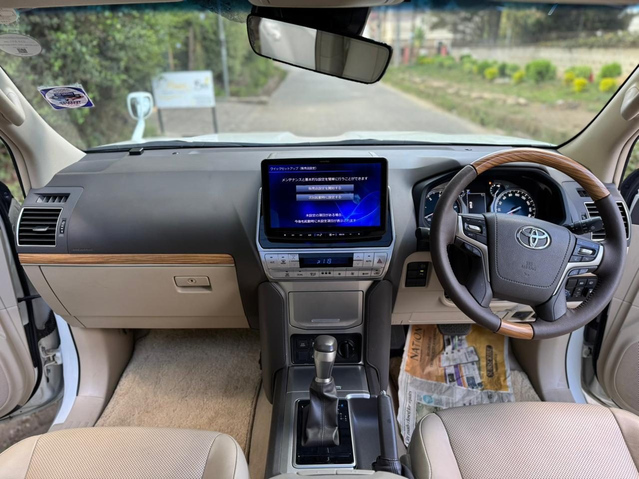 The 2018 Prado TX-L’s interior feels like it was crafted with elegance in mind. Every inch breathes refinement — from the smooth beige leather that lines the seats to the plush carpeting that cushions every step. The seats sit high, offering an aura of command yet wrapped in undeniable comfort, with powered adjustments and heating functions for tailored ease. Rear passengers are met with luxury of their own, complete with twin entertainment screens, ventilated air vents, and a quiet cabin that cocoons you from the world outside. The console flows cleanly through the center, metallic accents contrasting subtly with soft-touch panels. Overhead, the sunroof draws natural light into the cabin, highlighting the gentle tones and serene layout — an interior made to define class and calm in equal measure.